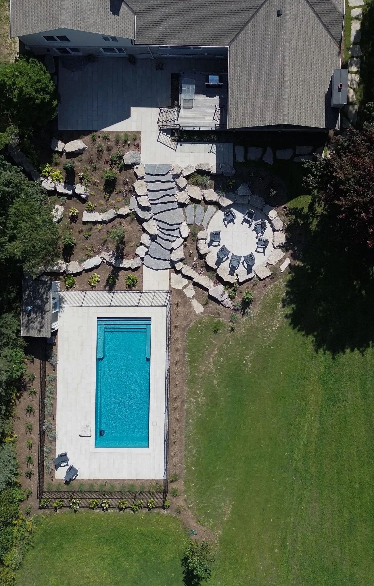 This property was designed to bring a Muskoka cottage feel to the heart of Centre Wellington. The backyard flows down through multi-level limestone armour stone terraces to a modern 16’ x 36’ rectangular pool, surrounded by Unilock’s Metro pavers in Safari for a clean, timeless look. A natural stone slab staircase connects each level, leading from the upper deck to a semi-sunk firepit, perfect spot for quiet summer evenings.